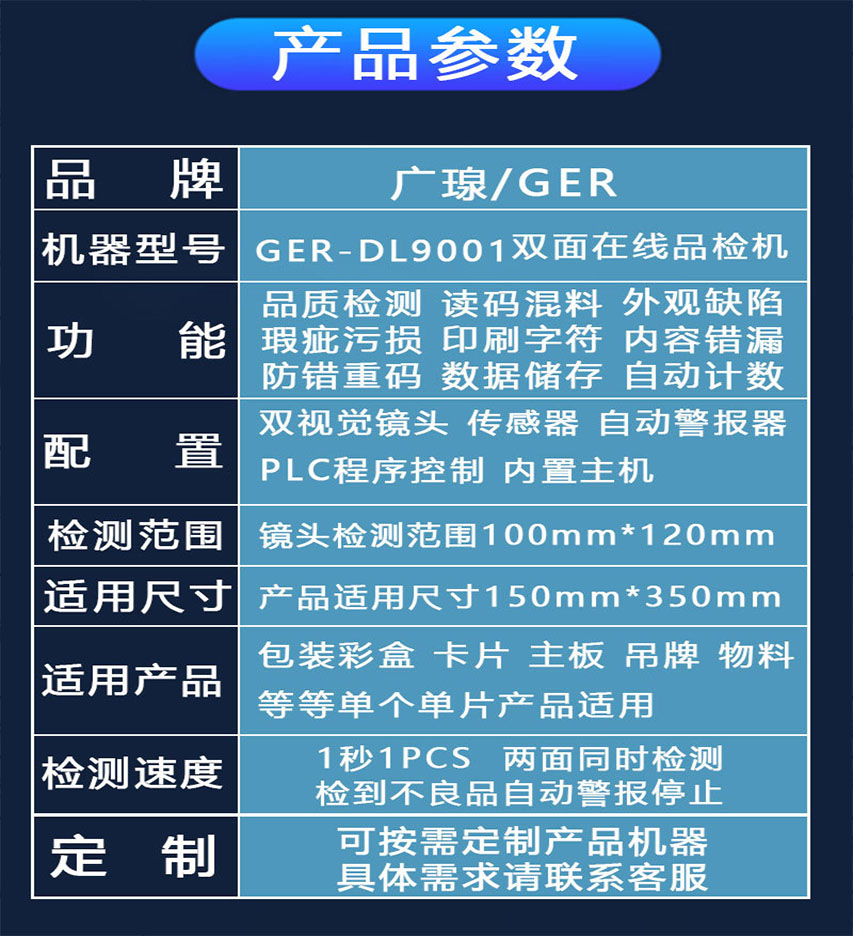 - 彩盒檢測設備型號:GER-DL9001 項目簡介: 廣瑔彩盒CCD檢測設備主要是為包裝企業通過機器視覺解決彩盒/禮盒/包裝盒生產過程中,出現的子件缺……
