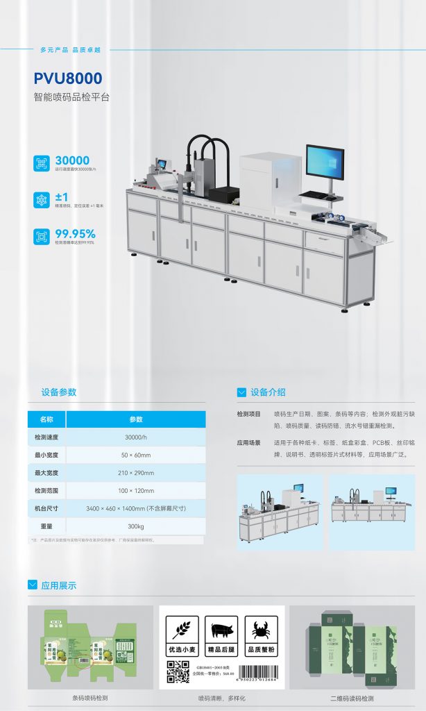 - 技術(shù)參數(shù) PVU8000 智能噴碼品檢平臺(tái)技術(shù)文檔 ?一、核心參數(shù) ?參數(shù)項(xiàng)??技術(shù)指標(biāo)?檢測(cè)速度30,000張/小時(shí)最小檢測(cè)尺寸50×60mm最大檢……